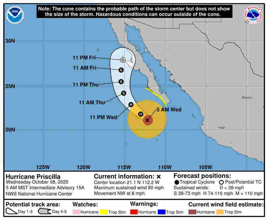 Hermosillo, Sonora; 8 de octubre de 2025.- El Gobierno de Sonora, a través de la Coordinación Estatal de Protección Civil (CEPC), informa que será durante el próximo fin de semana cuando se presenten las lluvias más importantes derivadas de los desprendimientos nubosos que llegarán a la entidad por el ciclón tropical “Priscilla”.