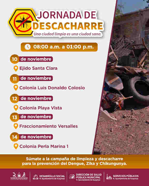Guaymas, Sonora 7 de noviembre de 2025.- Para dar seguimiento a las acciones preventivas contra el dengue, zika y chikungunya en la comunidad, habrá del 10 al 14 de noviembre Jornada de descacharre de 8:00 de la mañana hasta las 13:00 horas, esto organizado por el Ayuntamiento de Guaymas a través de Desarrollo Social, Servicios Públicos y Salud Pública Municipal.