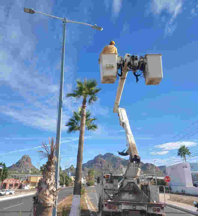 Guaymas, Sonora, 2 de diciembre de 2025.- Como parte de las acciones para fortalecer la seguridad y mejorar la imagen urbana, el Ayuntamiento de Guaymas a través de la Dirección de Servicios Públicos, mantiene de manera constante los trabajos de reparación e instalación de lámparas en distintos sectores del municipio.