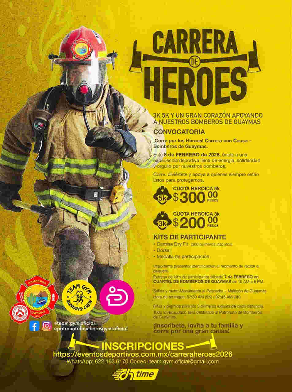 El Patronato de Bomberos Guaymas y Team Gym Running Crew continúan invitando a toda la comunidad para que participen el domingo 08 de febrero 2026 en la “Carrera de Héroes” a beneficio de Bomberos Guaymas.