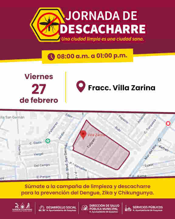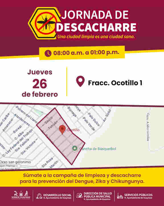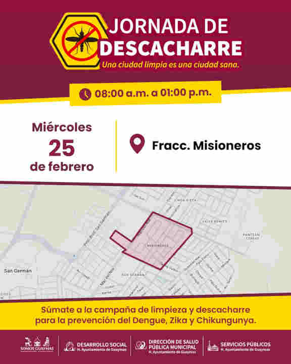 Guaymas, Sonora, 23 de febrero de 2026.- Para prevenir enfermedades como zika, dengue y chikungunya además de promover la limpieza de la ciudad, del 25 al 27 de febrero habrá Jornada de descacharre en Misioneros, Ocotillo I y Villa Zarina.