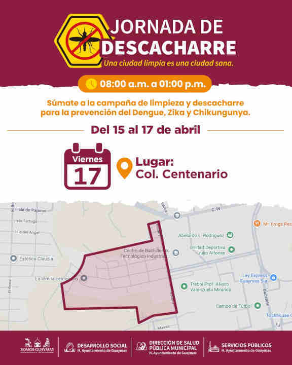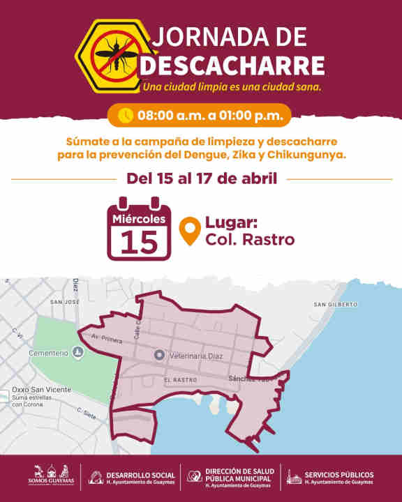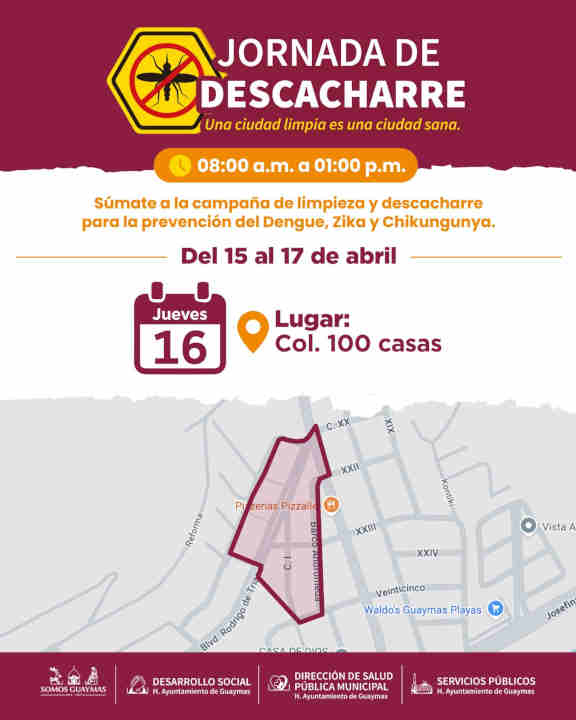 Guaymas, Sonora, 13 de abril de 2026.- Para promover la limpieza de la ciudad y trabajar en acciones que ayuden en la prevención de zika, dengue o chikungunya, el Ayuntamiento de Guaymas realizará jornada de descacharre este próximo 15, 16 y 17 de abril, anunció Austria Castro Gracia.