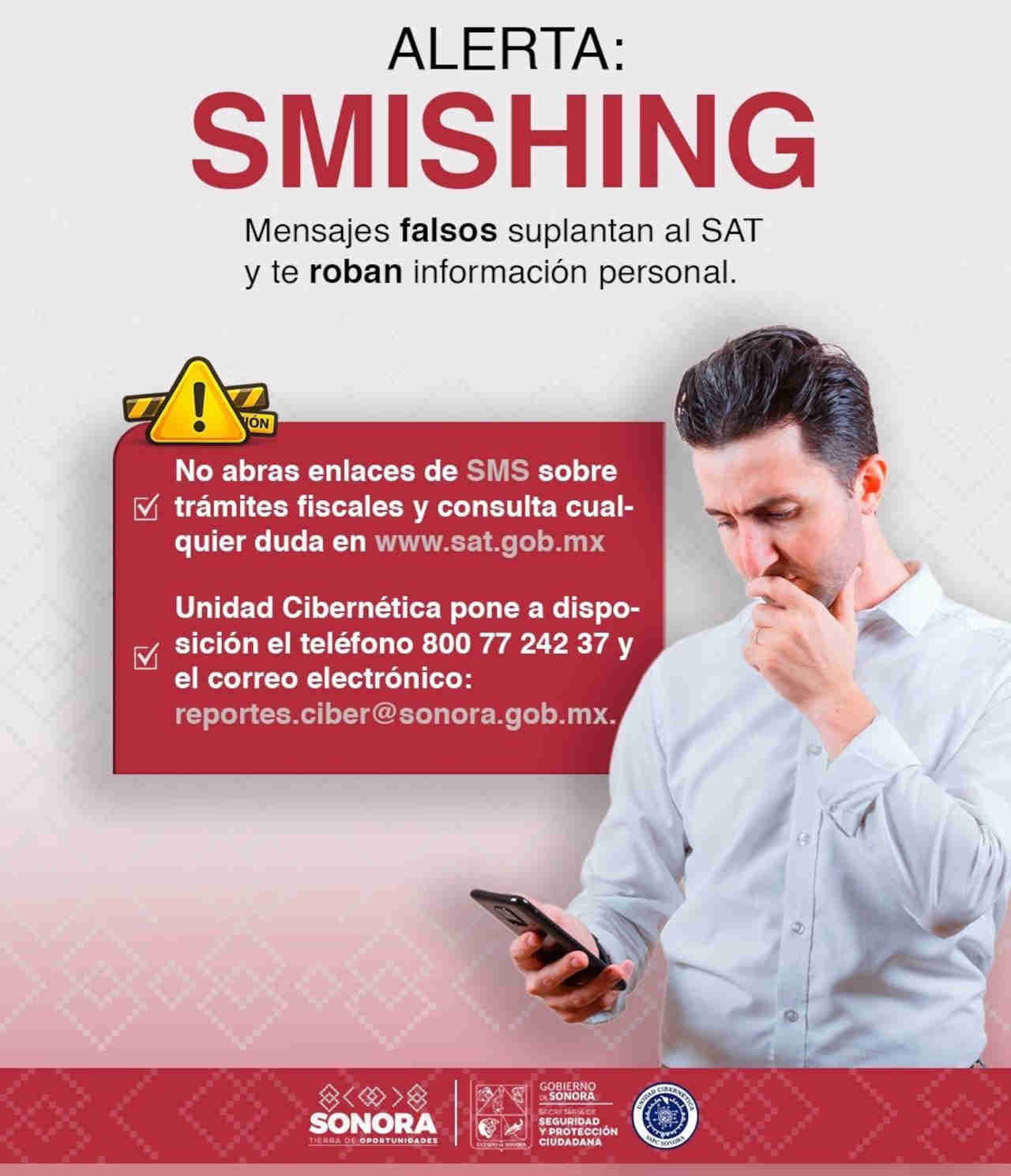 Hermosillo, Sonora; 14 de abril de 2026.- La Secretaría de Seguridad y Protección Ciudadana (SSPC), a través de la Unidad Cibernética, alerta a la ciudadanía sobre mensajes de texto (SMS) falsos que suplantan al Servicio de Administración Tributaria (SAT) con el fin de obtener información personal y bancaria, conocido como “smishing”.