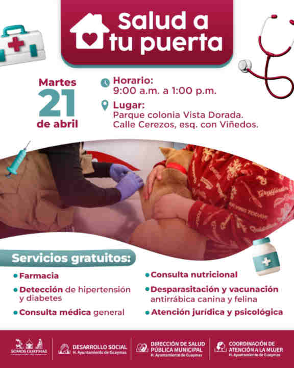 En un esfuerzo por trabajar en la prevención de enfermedades, este martes 21 las familias de la colonia Vista Dorada contarán con la visita del personal de Desarrollo Social, Salud Pública y la Coordinación de Atención a la Mujer, para proporcionar consulta médica general, detección de hipertensión y diabetes, servicio de farmacia, nutrición, y para las mascotas desparasitación y vacunación antirrábica.