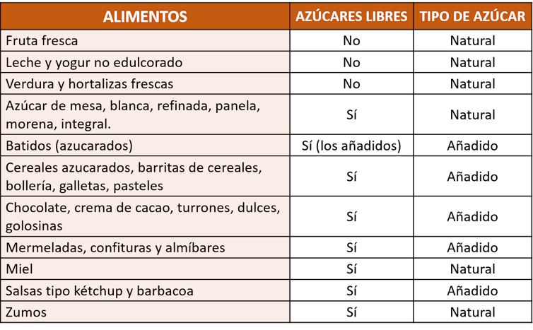 Los azúcares naturales de las frutas, verduras, hortalizas frescas y leche no son considerados libres y, por lo tanto, son recomendados. Los del azúcar de mesa, la miel, los zumos, los jugos de fruta y los concentrados de jugos de fruta (zumos), sí son azúcares libres y debemos evitarlos.