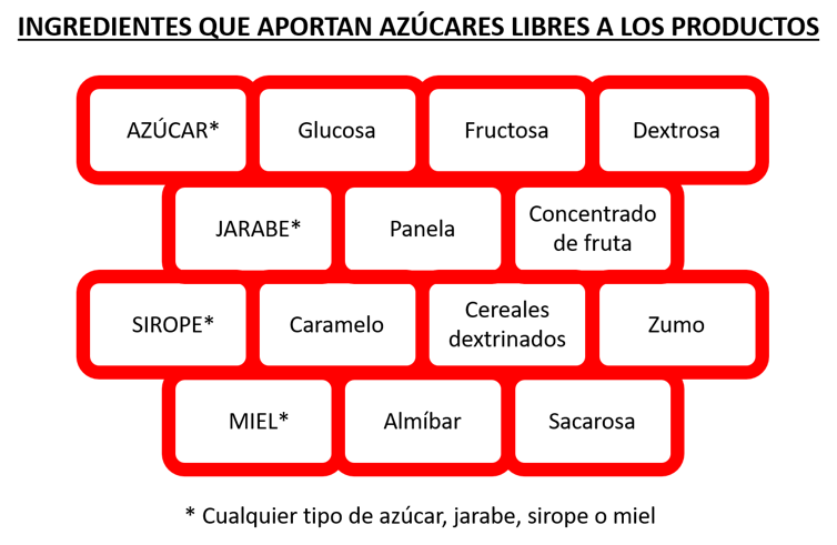 Los azúcares pueden añadirse a los productos a través de toda una colección de ingredientes. Los más habituales son los azúcares de cualquier tipo y los jarabes, aunque también se recurre con frecuencia a los siropes y la miel. Glucosa, fructosa o dextrosa también aportan azúcares añadidos y libres.